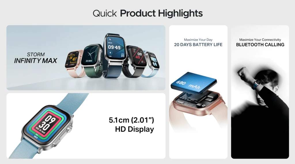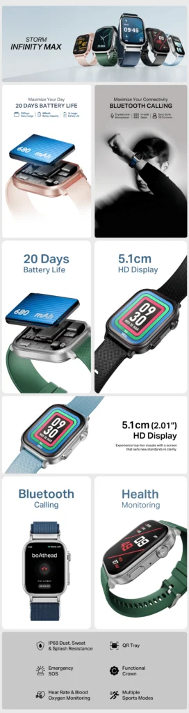 Unleash the power of infinity on your wrist with the all-new boAt Storm Infinity Max. Designed for those who demand more from their smartwatch, it boasts a massive 2.01” HD display, rugged IP68 resistance, and 20-day battery life for unmatched endurance. With cutting-edge health tracking, customizable watch faces, Bluetooth calling, and an intuitive functional crown, this smartwatch is built to keep you connected, in control, and a step ahead—always.